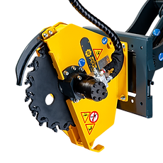Hydraulic wheel saw attachment for mini excavators and skid-steer loaders. Maximum digging depth 630 mm.